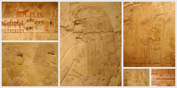 Wat ook gaaf is in deze tempel is dat er zowel opliggende relief zijn als diepliggende relief is en verschillende schilderingen. Daarnaast zien we ook de verschillende stadia, want deze R'mose is ook vrij plotseling overleden en nog niet alles was af. We zijn de rode horizontale en verticale strepen, omtreklijnen en uitsnedes. Op sommige opliggende relieffiguren is alleen de omtrek van het oog ingetekend.