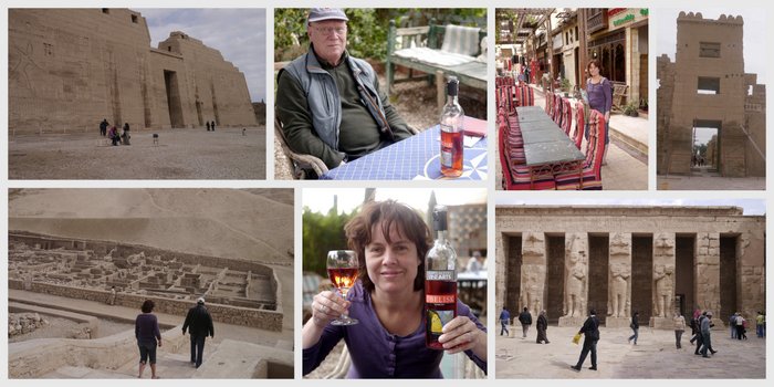 Onze laatste dag in Luxor gaan we weer naar de graven en tempels aan de westzijde. Eerst gaan we naar de tempel Medinat Habu. Dit is een grote tempel met mooie kleuren en reliëfs. De cartouches van Ramses III zijn heel diep want hij wilde voorkomen, naar voorbeeld van zijn voorouders, dat zijn sporen gemakkelijk te wissen zouden zijn.